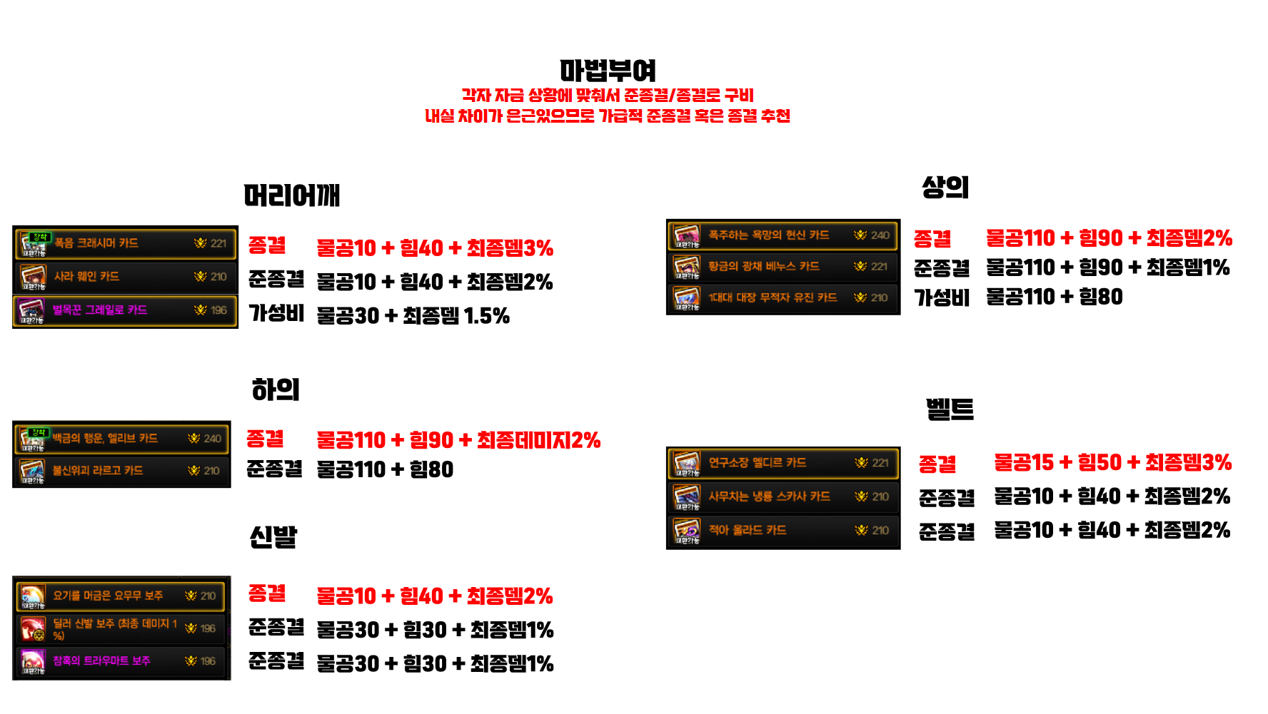 그 이하는 획득하신 에픽등급이나 레전더리가 많으시다면 단품섞어쓰는게 더 쌜 수 있습니다.