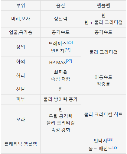 다만 특수장비 부위의 경우 종류 35~80제 + 단순범위증가 까지 그 종류가 매우 다양하고