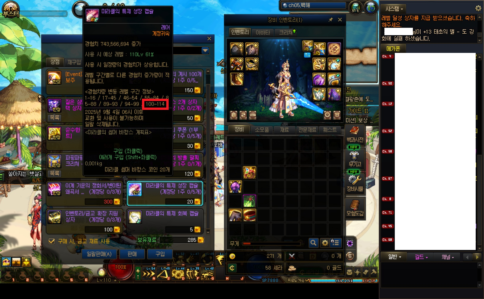 (수정) 25년 6월 5일 @@@의 특제 성장 캡슐로 바뀜, 114까지 먹어 115 만렙 찍을수 있음, 110레벨 구간에서 2개 먹을시 1업