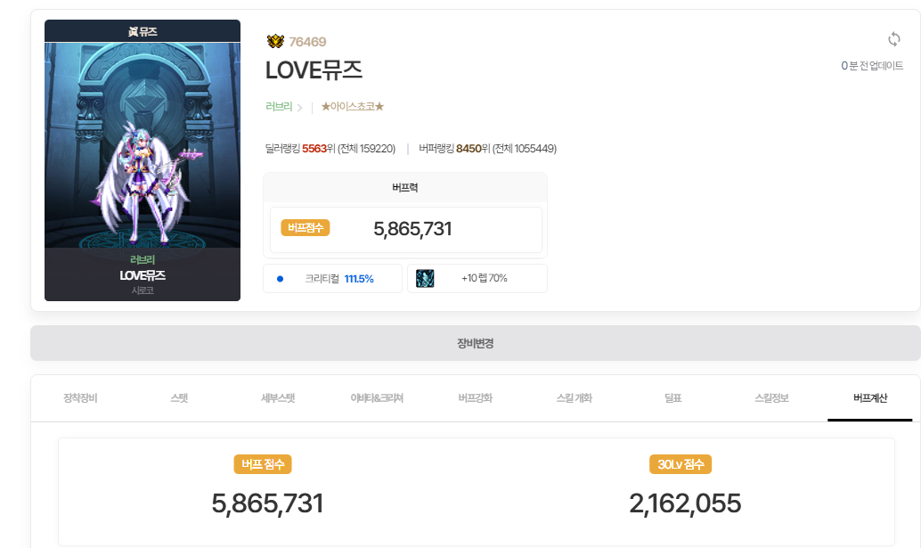 뮤즈의 메인 버프 스킬 첫째는 러블리 템포이며 타버퍼의 영광의 축복/용맹의 축복/금단의 저주와 같습니다.