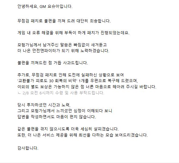 와 무점검 피해 보상이 그냥 피로도물약30이란다... 참... 진짜 운영 줫같이하네 던파 진짜 정떠난다...