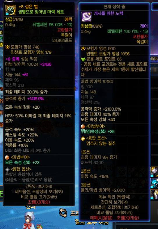 왼쪽 장비(마부, 8증)까지 진행하였다가 최근에 복귀 했는데, 복귀장비-오른쪽 장비 (마부, 융합)와 계승을 하면 인챈트가 서로 바뀌어서 모험가 명성치가 엄청 내려갑니다!