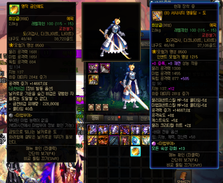 방금 헬뛰다가 명작 금인예도 라는 무기를 먹었는데요 둘중에 뭐를 껴야할지 몰라서 서사시의 영웅담 도 > 금인예도로 계승 시키는게 나을까요