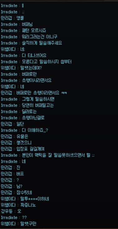 상황) 베누스 1단 팟이었는데 파장님(만리검) 벞(위햄이다) 저(Irradiate) 나머지 딜러분 이렇게 4명이었는데 처음에 파장님이 시작하기 전에 벞한테 초행인지 물었는데, 벞님이 '버퍼로만 초행이라고 말씀하셨음' (벞님이 말씀하신것도 스샷하려했더니 채팅내용이 계속 올라가서 짤렸네요 증거로는 파장님도 '버퍼로만 초행이시라면서요 ㅋㅋ'라고 한걸보면 알 수 있음) 겜하다 보니 벞님이 패턴을 모르는것 같아서 계속 죽고 처 맞고, 베누스 별자리 관련 패턴도 실패하길래 물어봄