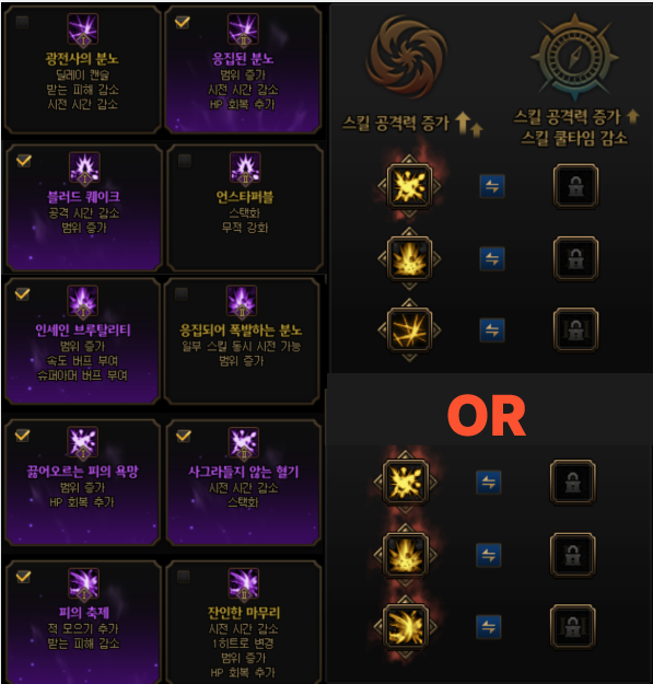 Lv.35에 묶여있는 격노와 블러디 레이브를 주력으로 사용하는 스킬트리입니다.