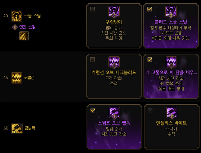블러드 소울 스틸은 적에게 부착 되는 스킬이며 쉬카리 사용시 즉시 데미지를 입힐 수 있기 때문에 블러드 소울 스틸 채용합니다