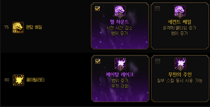 칠흑의 정화 타락세트 기준이며 쿨타임이 모자라 페이탈리티 쿨타임이 40초를 넘어가신다면 페이탈리티는 쿨타임 감소로 바꿔서 사용하시면 됩니다.