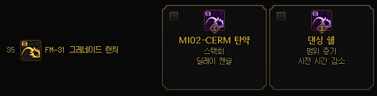 Lv.35 - FM-31 그레네이드 런처 : 미채용