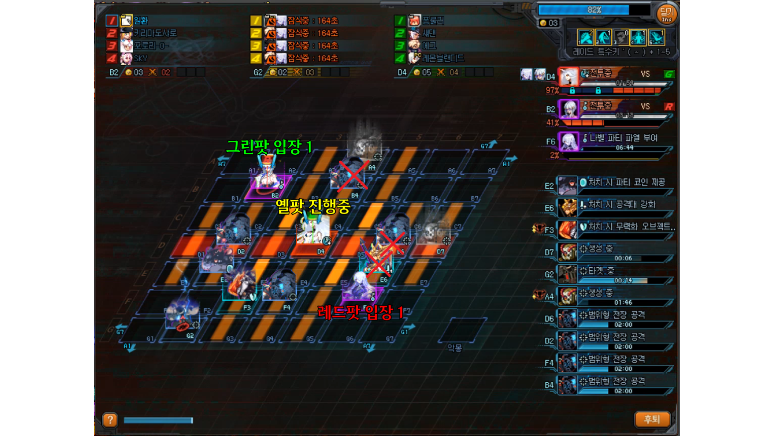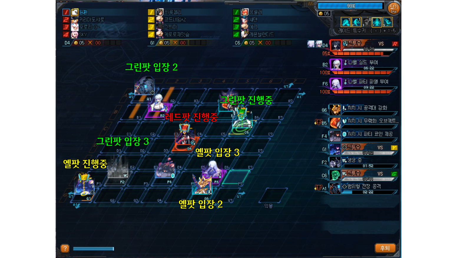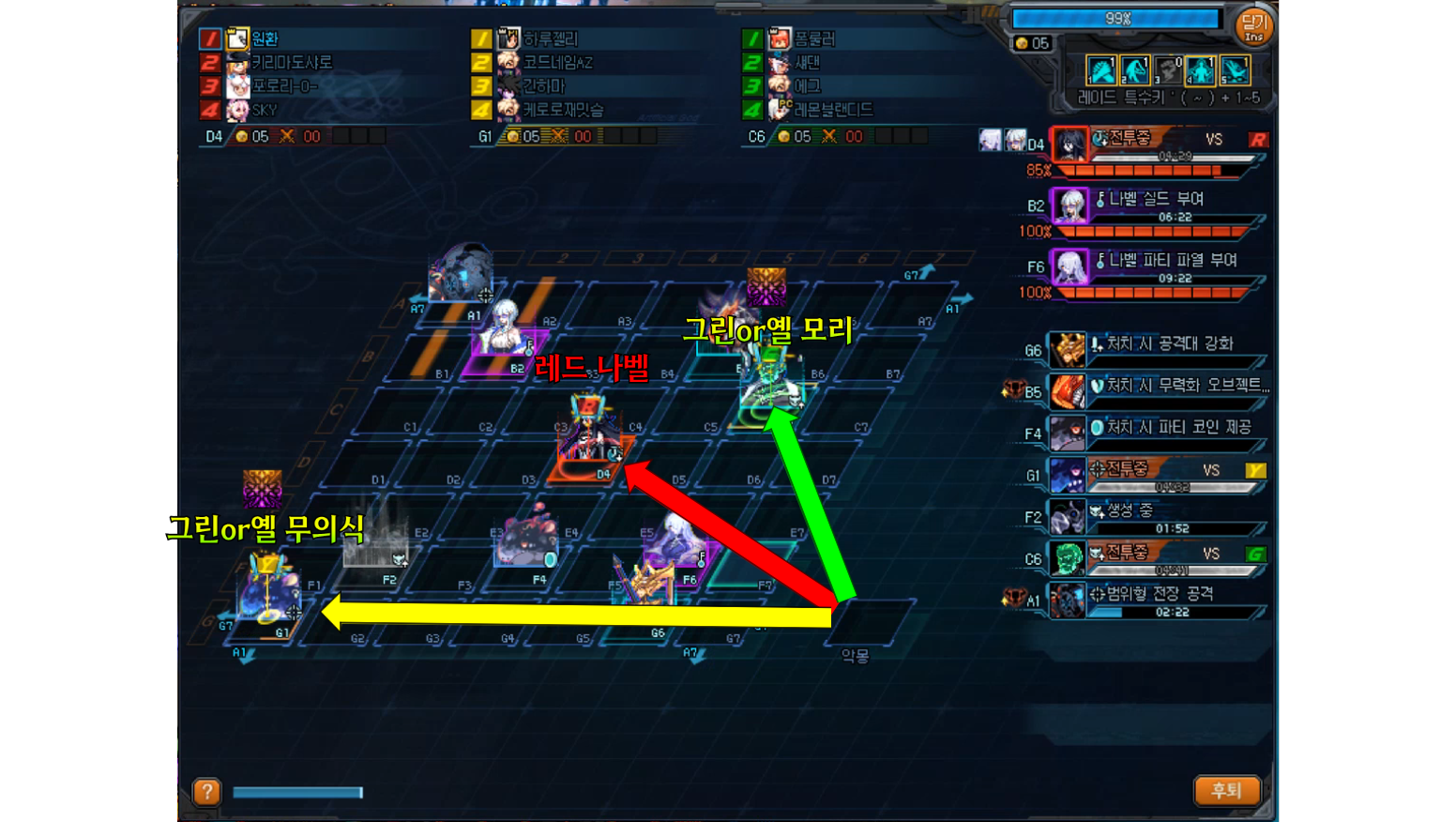 옐로 : 테아나 -> 나벨 교대 (교대까지 시간이 좀 남아있으면 잡몹 트라우마 1~2마리 정리, 1단 강화면 걍 입포컷)