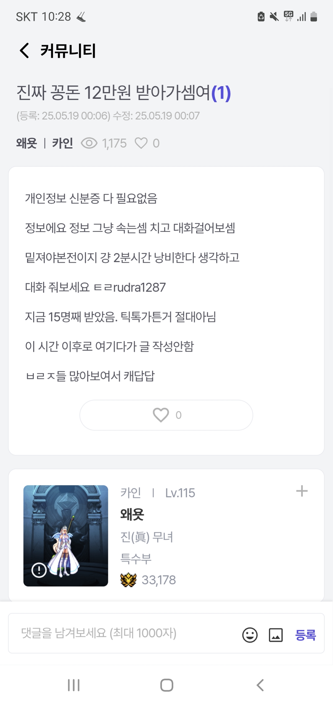 5. 15명의 사람들이 받아갔다는데 인증이 없고 답답하다며 불특정다수에게 보란듯이 ㅂㄹㅈ라고 욕하는거보면 아무도 본인에게 연락을 하지 않은것이다.(나 말고도 혹해서 15명이나 이미 연락을 해서 돈을 받았다고 작위적 글을 작성하게 되면 사람 심리상 나도 그럼 시간 버린다셈치고 연락해볼까? 라고 생각이 들수 있게 하는 수법이다. 결론은 진짜 시간버리는 짓이니 안하는게 맞다.)