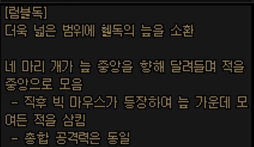 한참을 장판으로 때리다가 끝날 때즈음 나오던 빅마우스가 금새 튀어나와 물도록 바뀌었습니다. 범위증가는 덤이라서 어지간하면 빗나갈 일이 없을 거라고 생각됩니다.