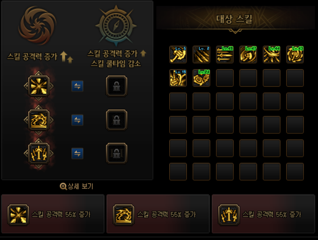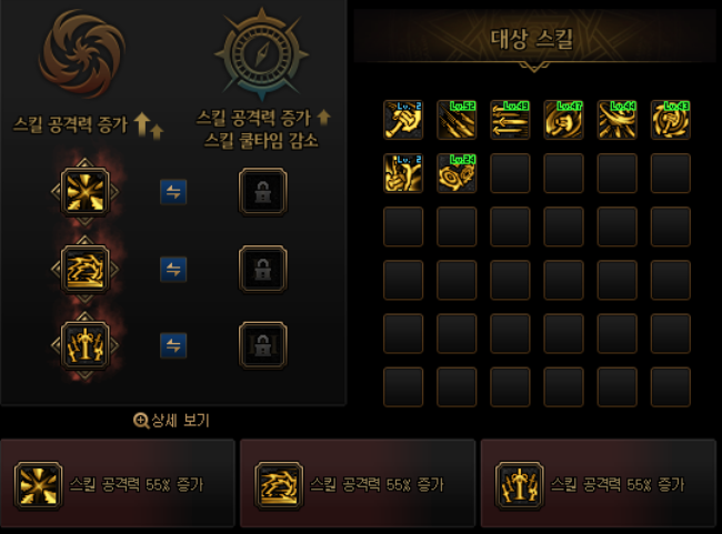 무기가 레거시 = 55% 강화 상급기 3개 + 스킬 공격력 증가 옵션 12.6% (창조반+황금향은 횟수땜에 쿨감20퍼)