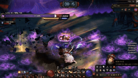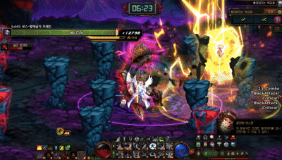 보스 몸에 원이 있는데 원 밖으로 나가면 이빨로 물어뜯음. 움짤엔 없는데 패턴중엔 파란 구슬이 간이영역을 캐릭터한테 생성함.