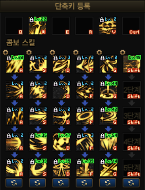 마법석 옵션 적용된 기본 쿨타임 15% 기준 위 스킬트리의 표기상 쿨타임은 A콤보 13초 / S콤보, D콤보 각 12초 / F콤보 16초 / G콤보 24초입니다.