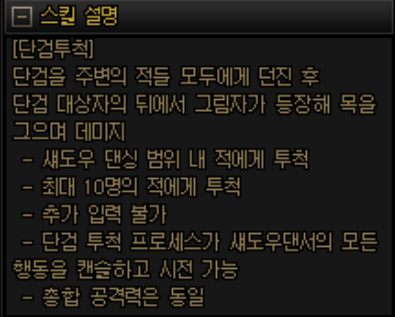 기존 단검투척은 잡몹의 체력이 너무 낮으면 섀도우 댄싱을 발동시키기도 전에 적이 죽어버립니다.