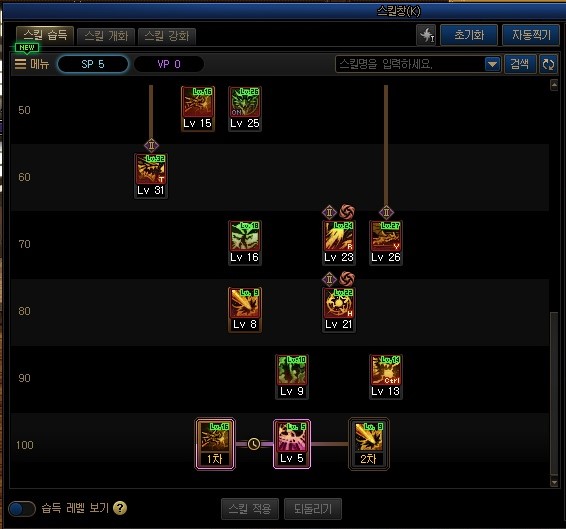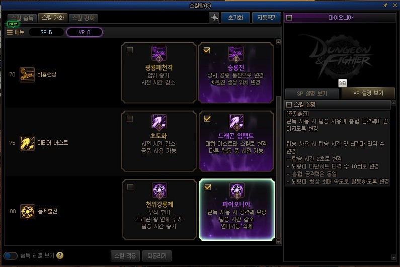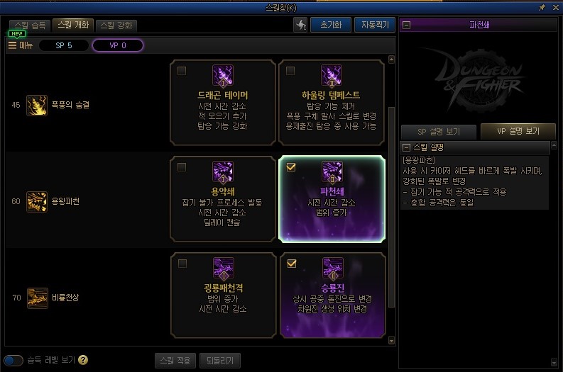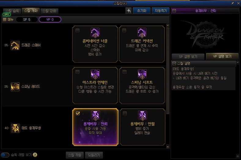 - 태도 용제무쌍(40제) VP 1번 / 용왕파천(60제) VP 2번 / 비룡천상(70제) VP 2번 / 미티어버스트(75제) VP 2번 / 용제출진(80제) VP 2번 선택 추천