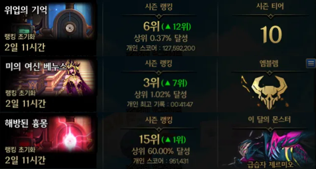 베누스 치다가 3위길래, 월초에 한번 치고 신경 끄던 위업과 흉몽 챌린지를 다시 해봤습니다.