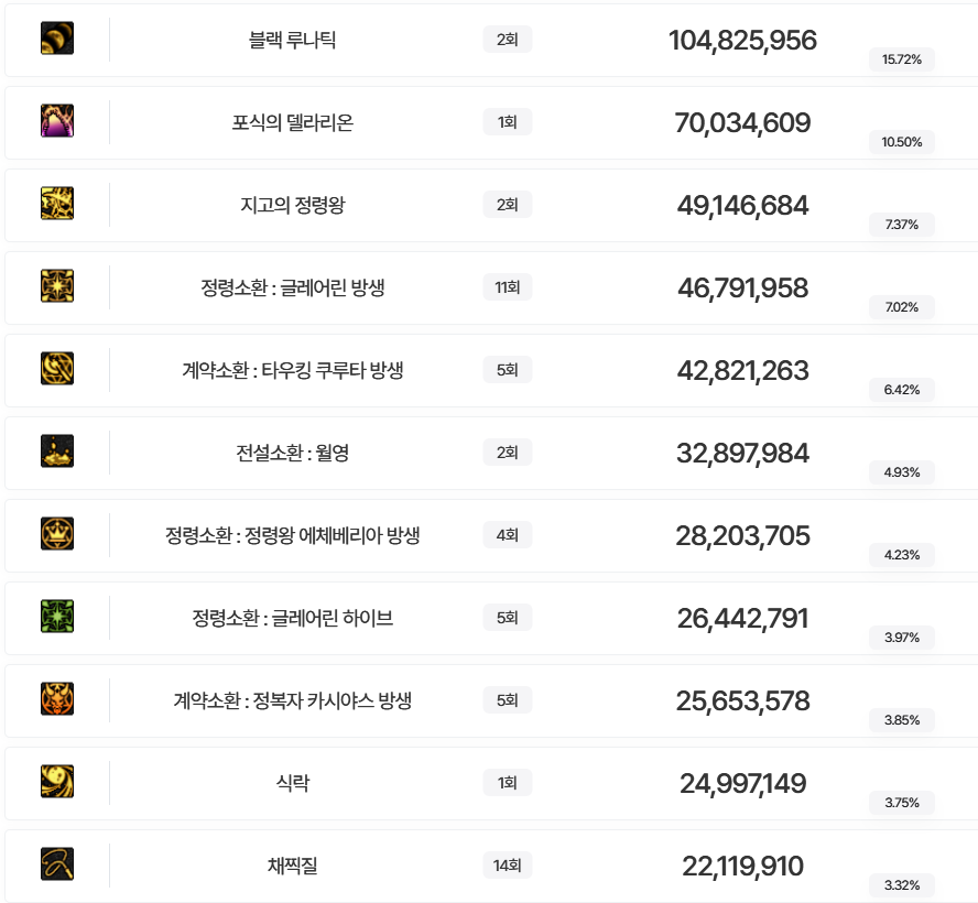 현재 던담딜상 지고, 월영, 루나틱 비중이 제법 높고