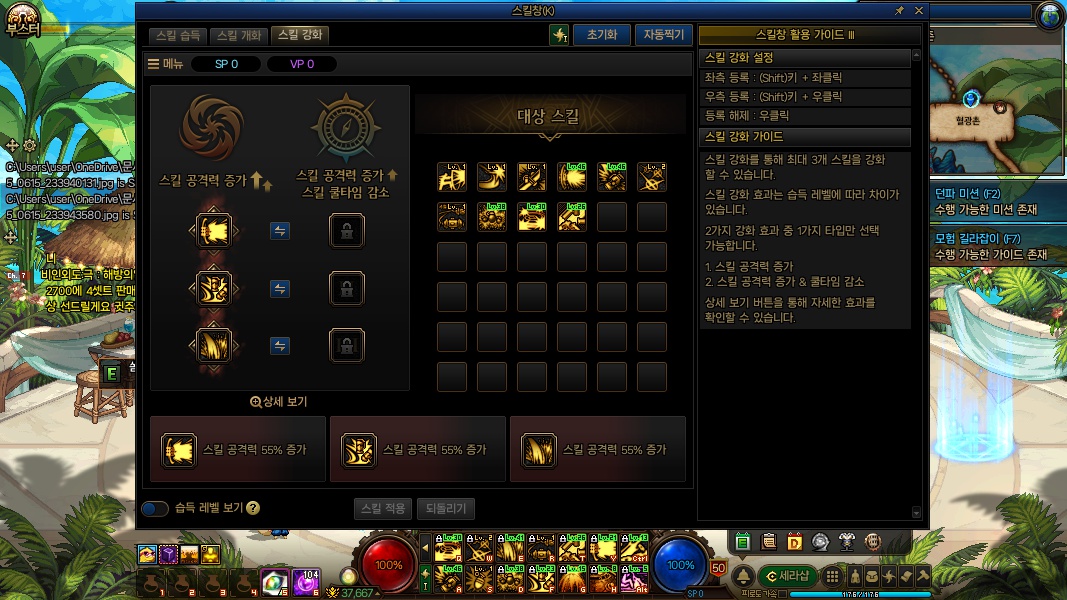 불필요한 스킬은 스킬창에서 내려놓은뒤 연계스킬을 올려놓고 쓰시면 간편하고 쉽게 게임을 즐길 수 있습니다.