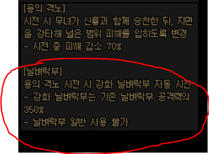 용의 격노의 범위가 주변으로 바뀌고 뎀감을 얻습니다. 시전중 날벼락부를 쓸 수 있는 추가기능도 얻습니다.