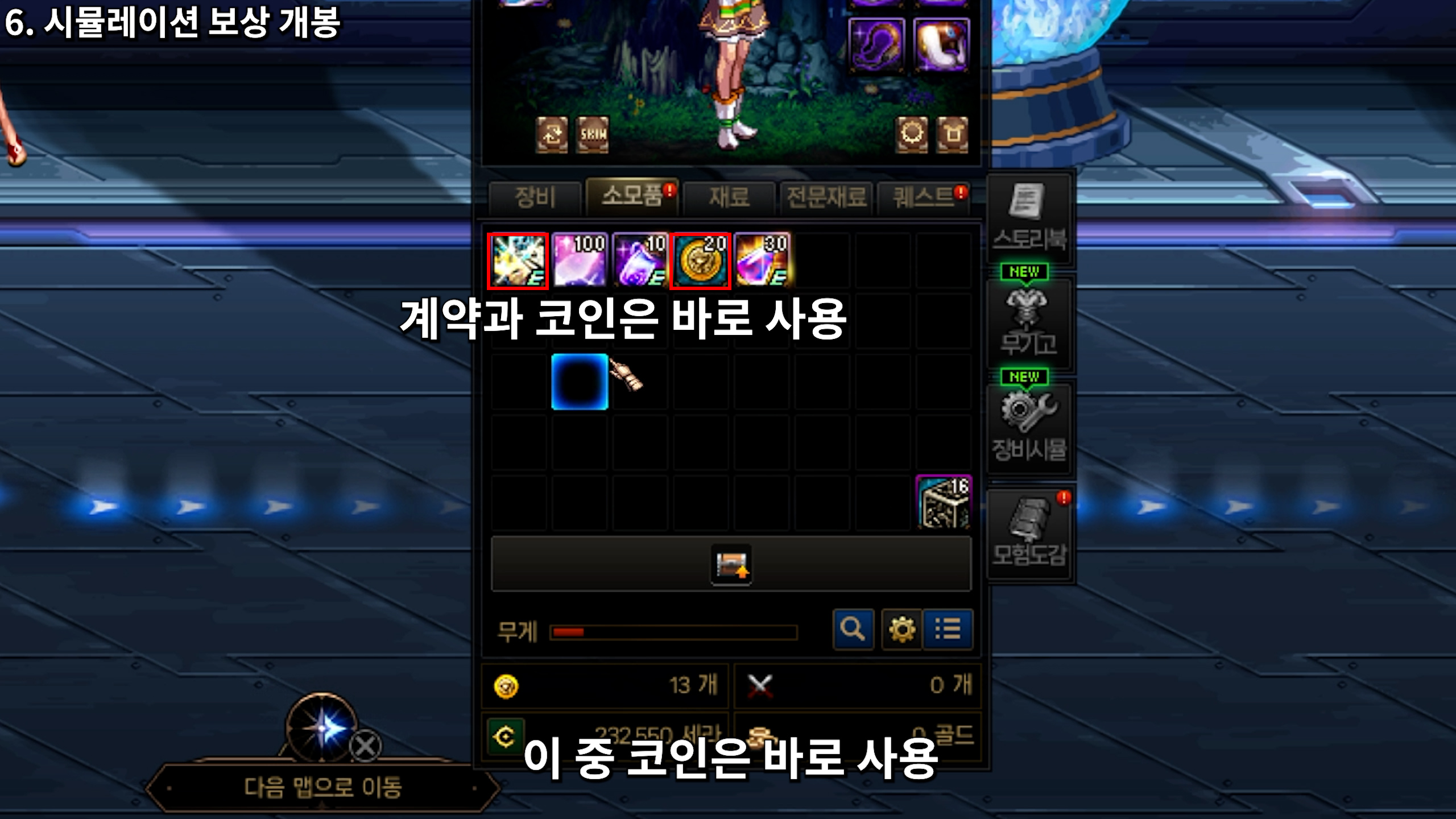 여기서 주는 보상들 중 계약과 코인은 바로 사용