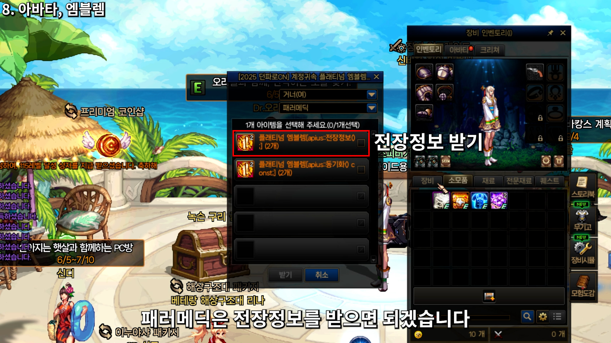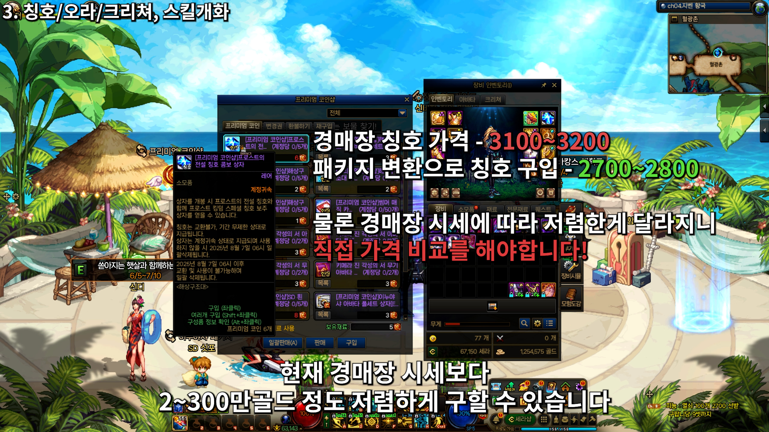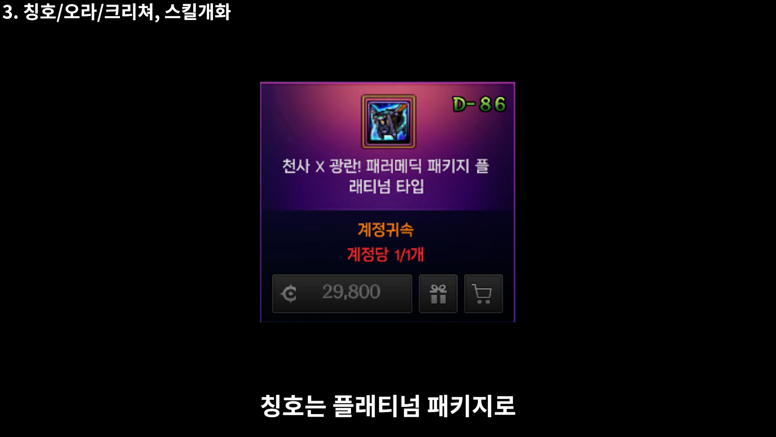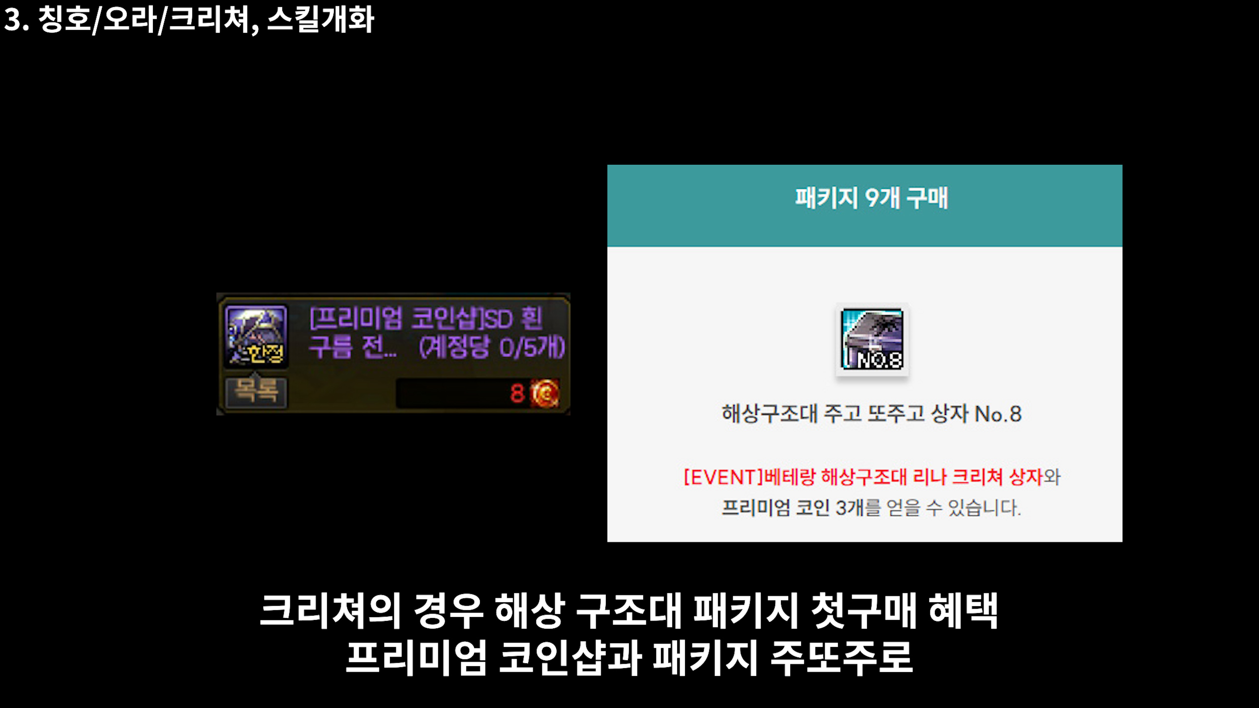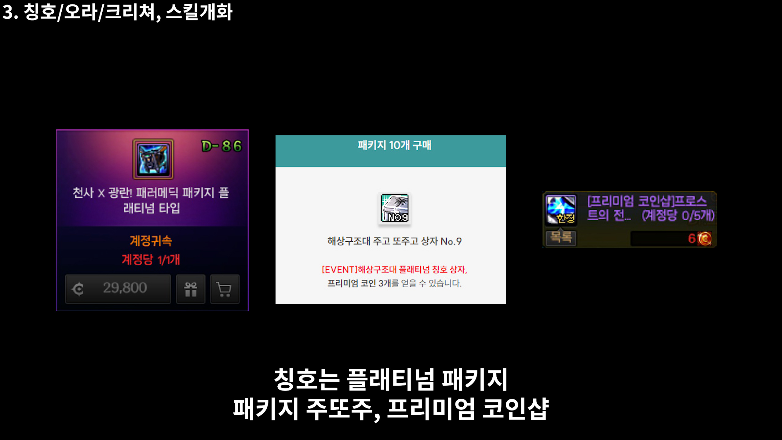 여기서 이벤트로 지급하는 칭호/오라/크리쳐는 모두 보급형 아이템입니다