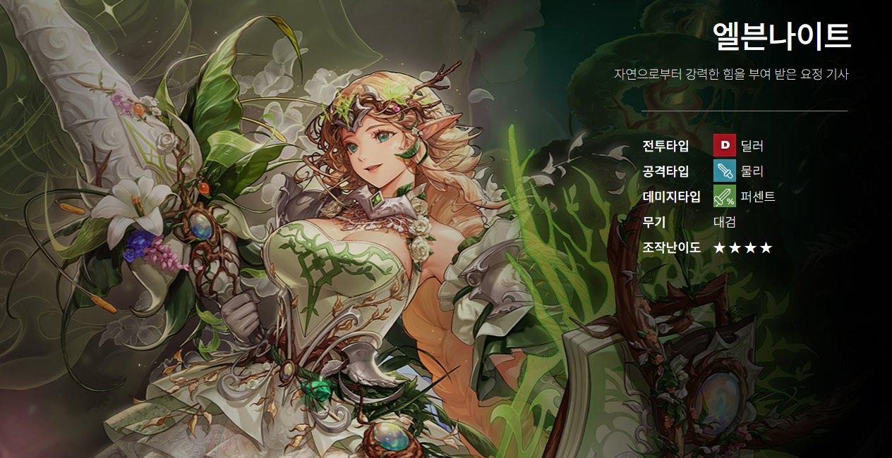 엘븐나이트는 물리 공격의 퍼센트 데미지 딜러로 스탯은 힘, 무기는 강화를 합니다.
