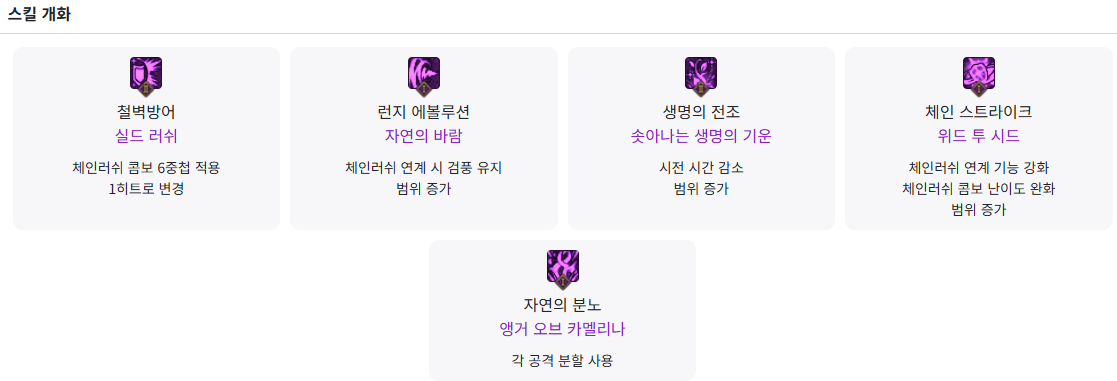| 자연의 분노 | 방패타격과 넝쿨소환을 각각 분할하여 사용 가능 | 넝쿨 공격이 전방으로 넓게 자라나는 공격으로 변경 |