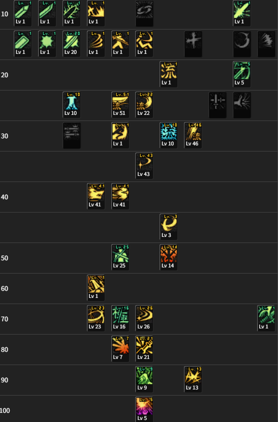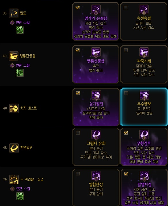 마지막으로 소검 개화입니다. 일단... 발도, 맹룡, 차버 1번은 고정입니다. 발도는 사용시 속도 상승이 유의미하게 체감되며, 차버는 심검에 버금가는 혹은 그 이상의 죽창기로 만들어줍니다.(소검1신은 레무클, 플칭을 40으로 가니까 심검보다 강할 수 있습니다.) 맹룡은 뭐... 말할 필요가 없겠죠.
