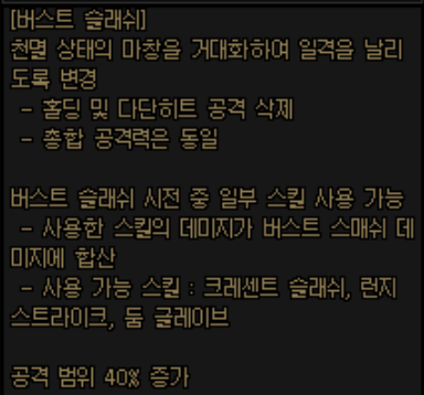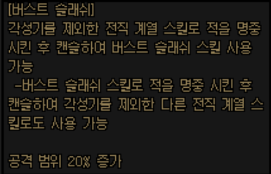 버스트 슬래쉬의 전후로 스킬이 연계되게 바뀌며, 스킬 범위가 20% 증가합니다.