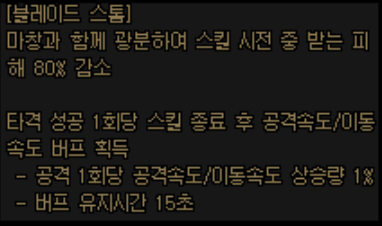 베는 중 받는 피해 80% 감소가 붙고, 타격당 속도 1%씩, 총 12%의 속도 버프가 걸립니다.