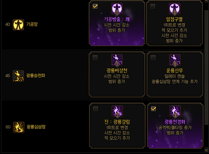 (ex. 현재 광룡천경화를 선택했는데 광룡의 쿨타임이 45초인 경우, 스킬 강화에서 광룡의 공격력 38% 증가 + 쿨감 15% 를