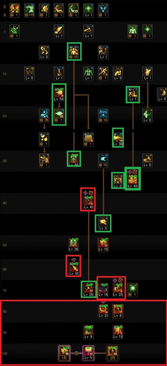 제가 사용중인 스킬트리입니다. 빨간색은 필수, 녹색은 선택 채용입니다.