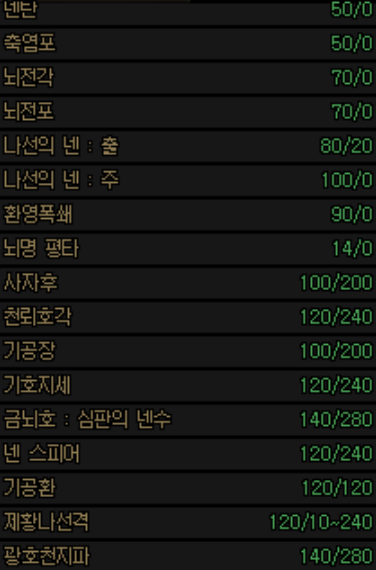각 스킬의 수급량 및 소모값은 위와 같습니다.