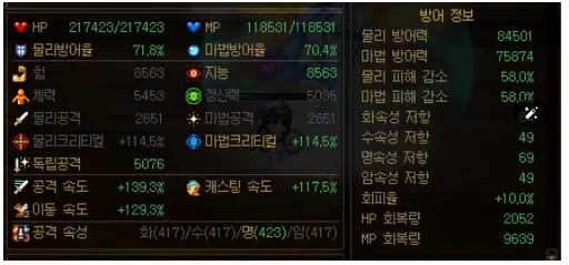 아래는 위 융합석중 반지 귀걸이 팔찌 마법석을 착용한 이후에 찍은 스탯창이다