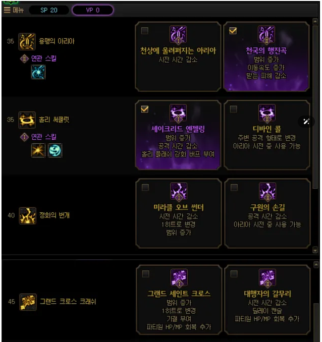그랜드크로스크래쉬 - 용맹의축복 - 수호의축복 - 용맹의아리아 - 크럭스샤피엘 - 에디피케이션 - 대천사의축복 - 신성한빛