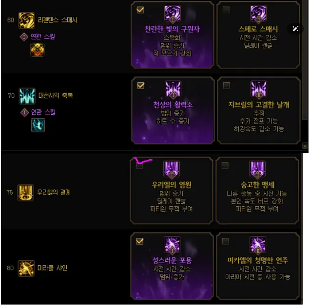 우리엘 쿨초로 파티원에게 1.5초 무적을 두번 주거나 미라클 샤인의 쿨초로 폭힐을 넣는것도 좋겠지만
