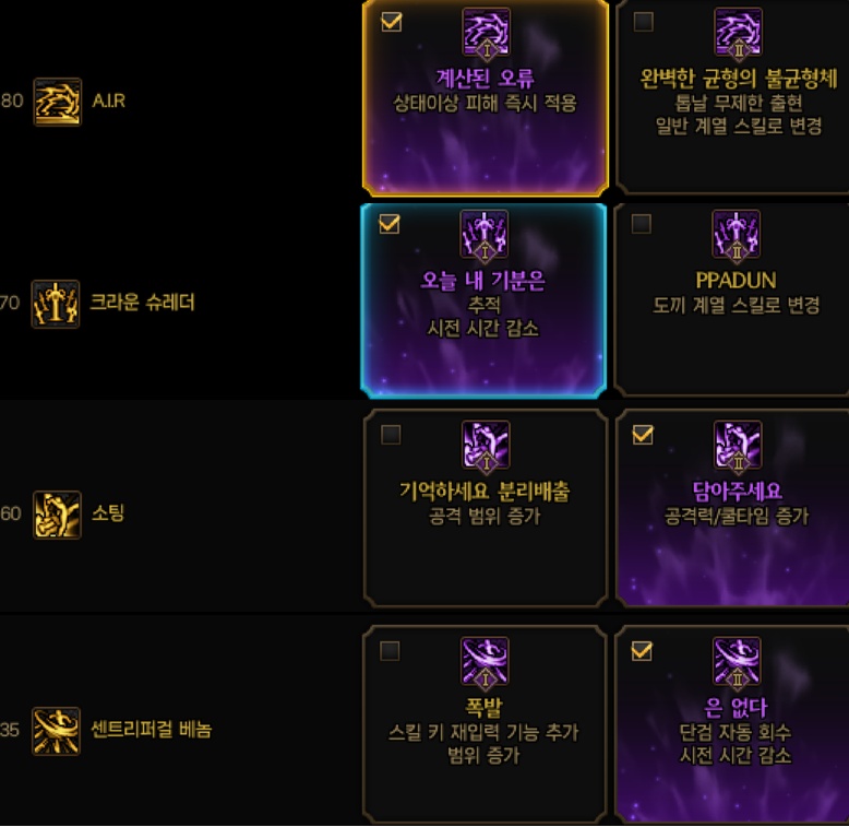 이제 이 두 곳에 스킬들을 배분해 넣으면 끝입니다!