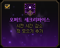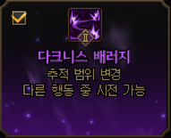 블랙미러에 속도 버프를 부여해주고 지속시간이 늘어납니다. 기존 2타맞추면 딜이 더 안들어가기 때문에 채용할 이유가 없는 VP입니다. | 블랙미러 범위 지정없이 즉시 캐릭터 주변으로 시전되며 범위가 상당히 커지고 1회 타격으로 바뀝니다. 블랙미러의 단점을 모두 없애주는 VP라 찍어주시면 좋습니다. |