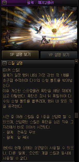 체이싱클러 스킬은 팔케의 다른스킬과 연계가 가능한 기능이 있기때문에 스택형으로 자주사용하며 좀 더 효율적으로 관리가 가능합니다.