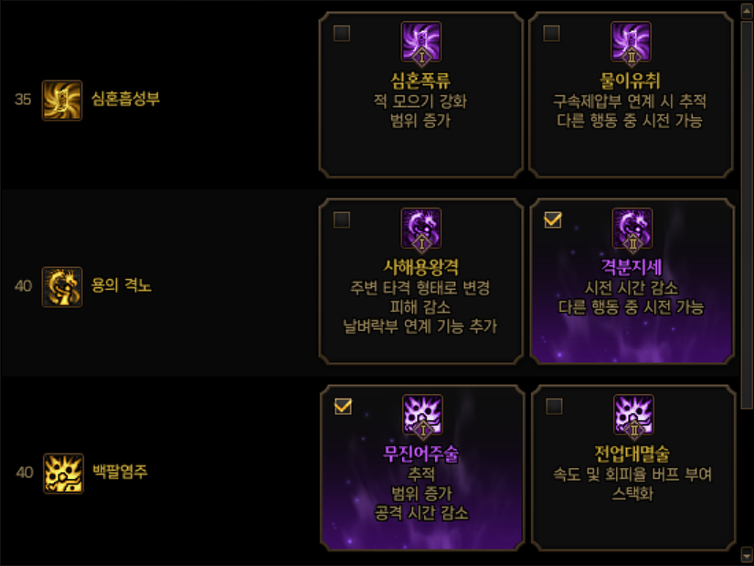 스킬 개화의 경우, 40제 용의 격노의 시전 시간 감소를 선택해줍니다.