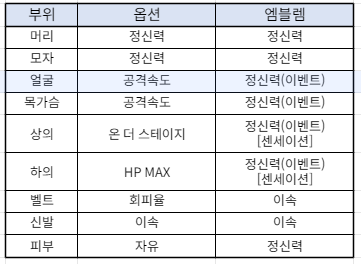 지속 시간이 5초 증가합니다. 한번 깔아두면 오랜 시간 동안 몹을 타격할 수 있어 속성 피해량 증가 버프를 묻히기 좋습니다. 또 회피율 20%도 쏠쏠해서 레이드를 갈 때 사용하고 있습니다. | 공격시간이 감소됩니다. |