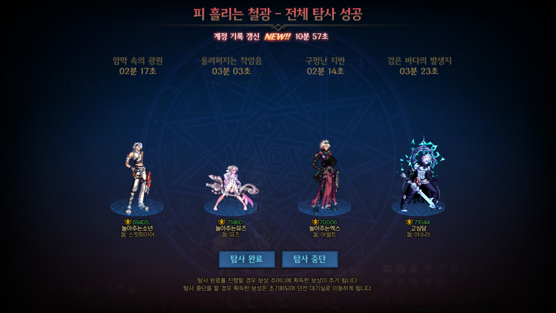 2차 시도는 제 캐릭터 중 솔플 화력이 가장 높은 남스핏을 선두로 세워 여유시간을 확보했는데
