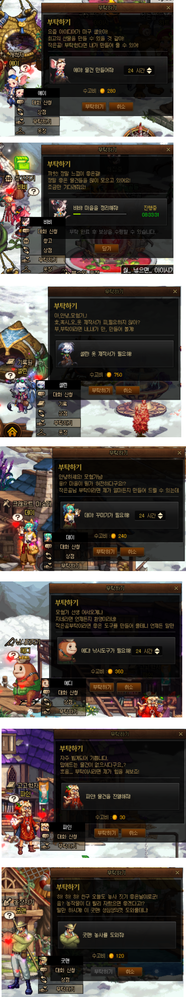 마을의 NPC들에게 호감작 MAX를 달성해야 나올수 있는 부탁하기 메뉴 활성화 완료