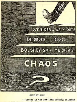 노동자 혹은 노조가 파업, 무질서, 볼셰비즘의 길에 들어서면서 사회가 단계적으로 폭동과 살인 그리고 혼란에 빠지게 되며 "그 결과는 알 수 없다"고 풍자하는 만평입니다.