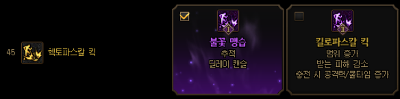 이 스킬트리의 정체성인 헥토파스칼 킥의 개화는 불꽃 맹습을 채용하였습니다.