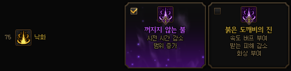낙화의 VP1 꺼지지 않는 불은 낙화를 머슬시프트 연계 후 시전 시(마셜아츠 스킬 + 낙화) 도약 모션을 캔슬하고 제자리에서 발동하도록 만들어 줍니다.