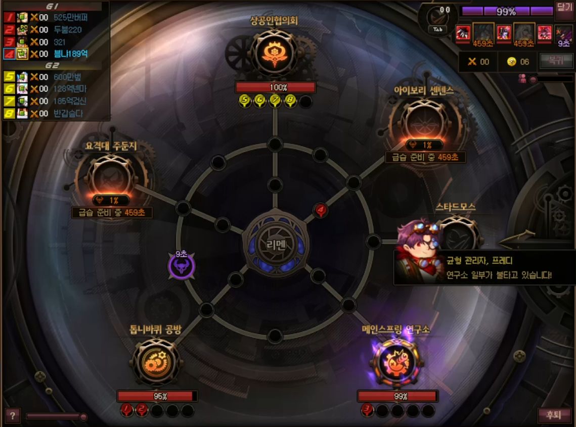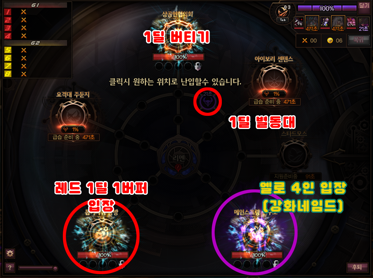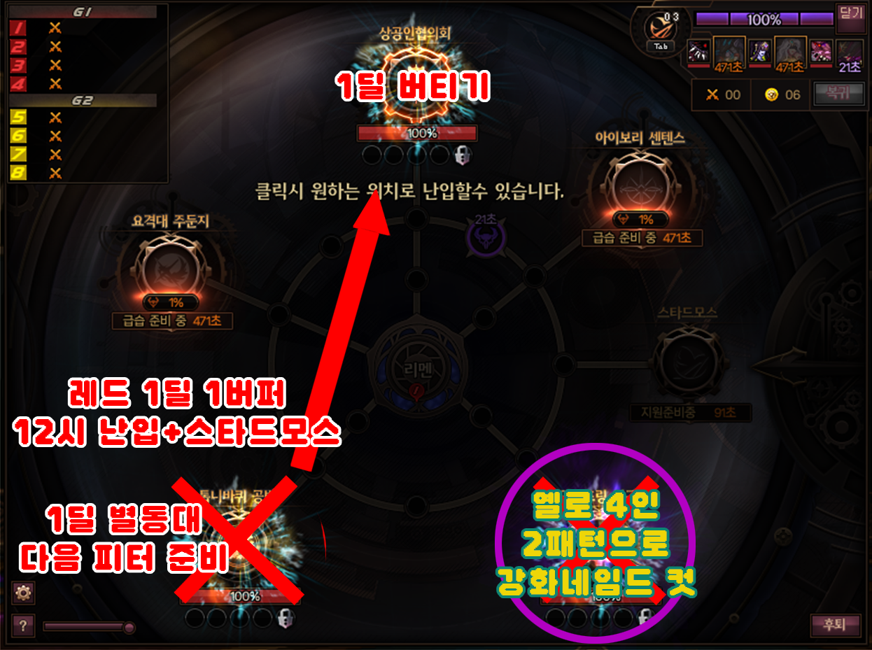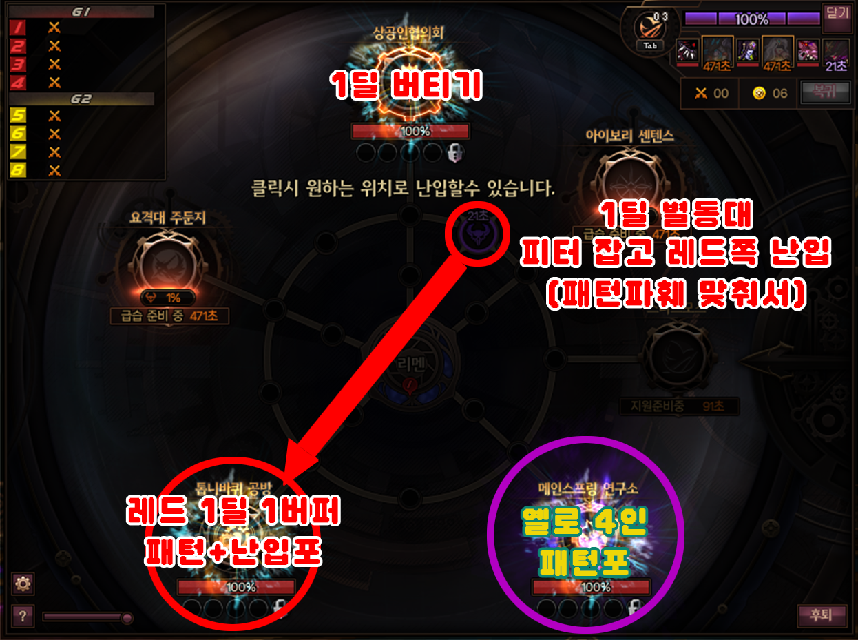 제가 공대장으로 진행한 상황판인데 레드 인원 중 버퍼와 딜러한명을 스펀저로, 레드 한명은 흉터를 틀어막고 저 혼자 피터 / 잡몹방을 정리, 옐은 4인 옴마를 진행시킨 상황이에요