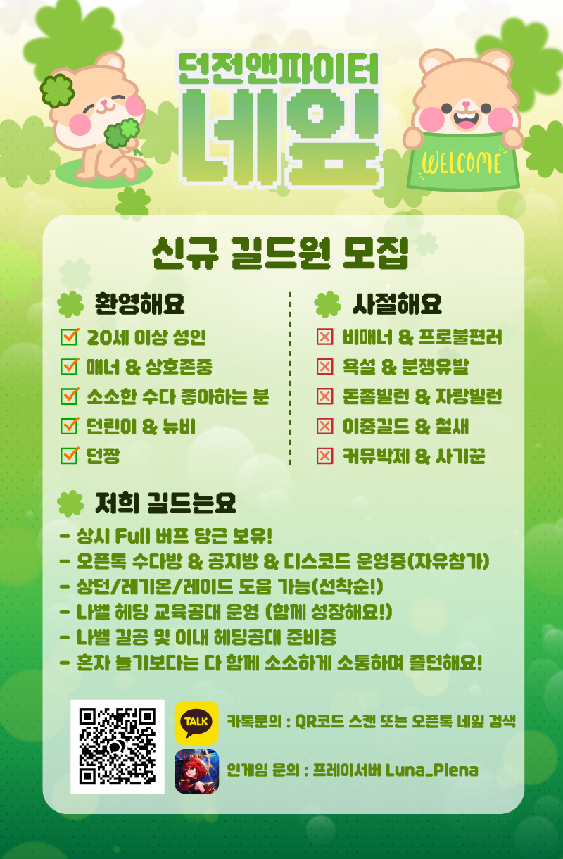 가입문의 - https://open.kakao.com/o/gUiRy3je 오픈채팅방 네잎 길드 검색
