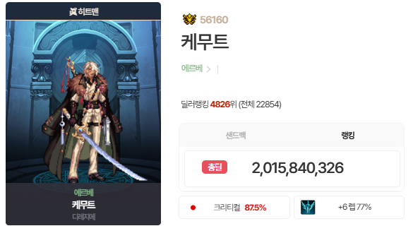 명성은 5.6k이며, 스펙은 던담에서 랭킹 딜은 20억, 샌드백 딜은 2.8억이 나옵니다.
